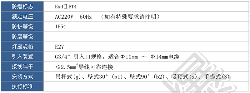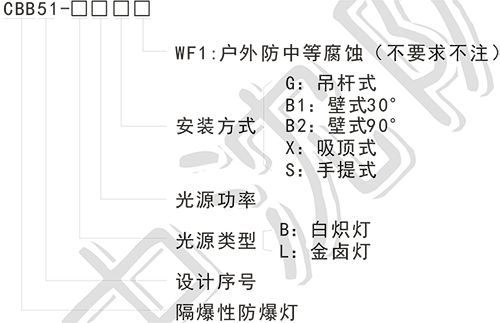 >?按照產品型號規格說明逐條選擇并注明防爆標志,例如:需要金鹵燈 70W,吸頂式安裝則產品選型為:CBB51-L70X ExdⅡBT4;