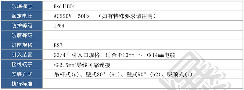 > 按照產(chǎn)品型號規(guī)格說明逐條選擇并注明防爆標志,例如:需要金鹵燈 100W,吸頂式安裝則產(chǎn)品選型為:CBB52-L100X ExdⅡBT4;