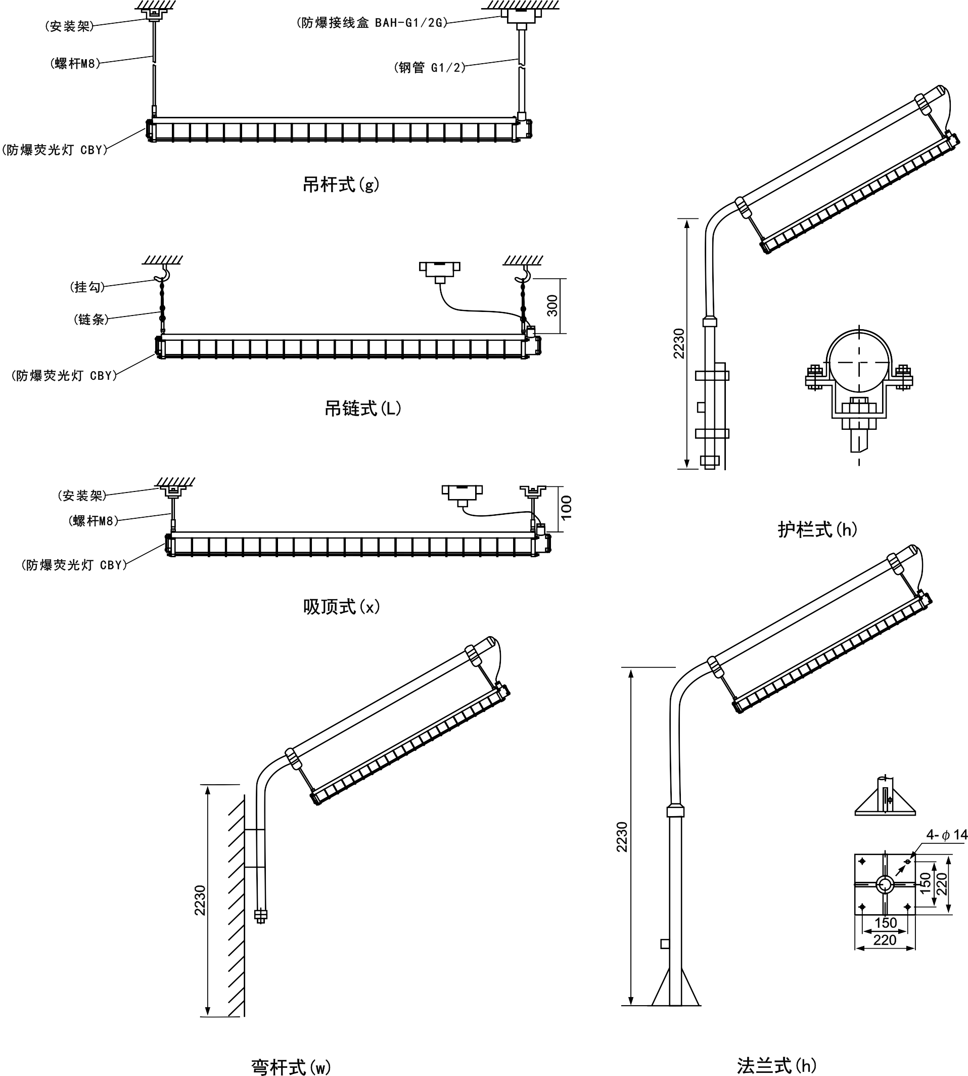 | 安裝方式 | 吸頂式(X)、法蘭式(F)、彎桿式(W)、吊桿式(G)、護(hù)欄式(H) | ||