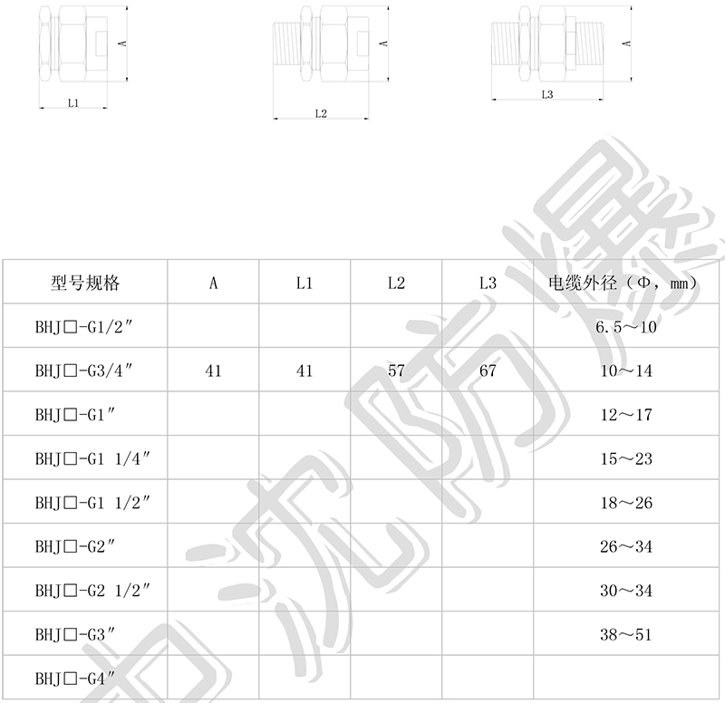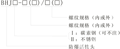 > 按照產(chǎn)品型號規(guī)格逐條選擇并注明防爆標(biāo)志,例如:需要隔爆型碳素鋼一內(nèi)一外 G3/4″螺紋防爆活接頭,則產(chǎn)品選型為 BHJ- G3/4(內(nèi))/ G3/4(外) ExdⅡC